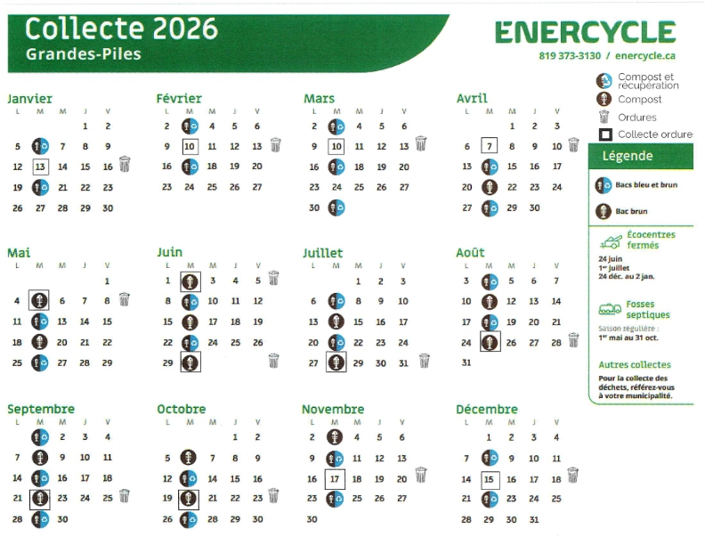 ÉNERCYCLE publie un bulletin d’information saisonnier qui contient des renseignements précieux sur la collecte des ordures et des matières recyclables. Ce bulletin est distribué dans les casiers postaux. Des copies sont aussi disponibles au bureau municipal.